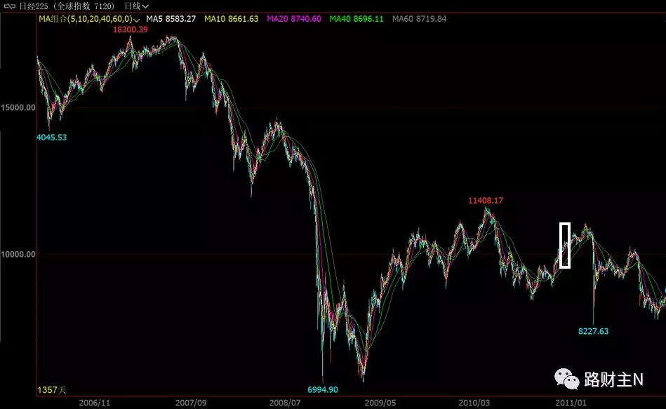 日本央行是在2010年底开始印钞进入股市的,当时的日本股市经过2008年以来的下跌,画风是下面这个样子(下图为日经225指数走势,白色矩形为日本央行介入时点)。