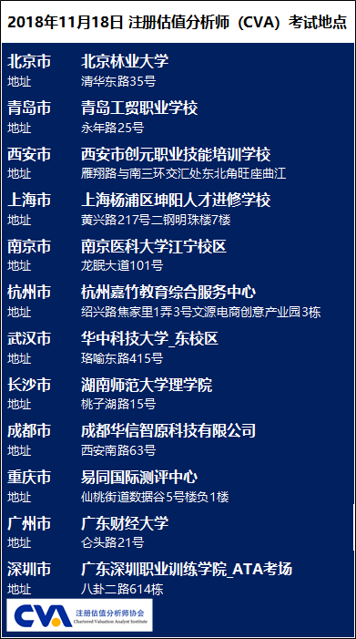 1)CVA协会公布2018年11月18日考试考点信息如下,请各位考生提前查询自己的考点位置,了解交通路况,做好备考准备。