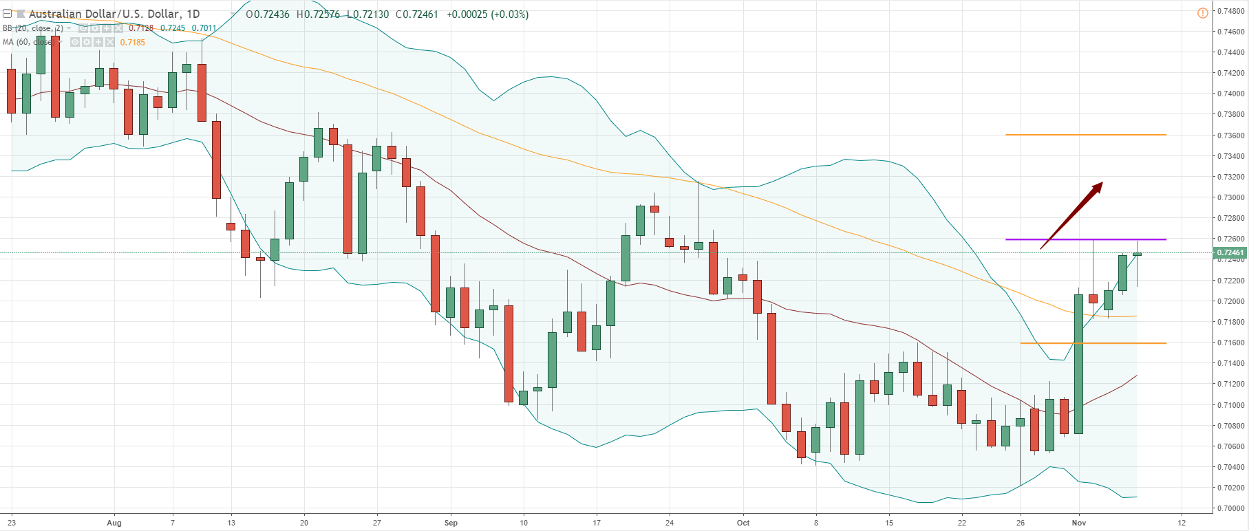 除此之外,估计美元会偏弱势,除了昨天的英镑继续以1.315为目标以外,也可以留意澳元(AUDUSD)的走势。昨天利率决议澳联储言论偏向鸽派,重申低利率为经济提供支撑,但澳元没有因此下跌反而上升,同时短期中港股市反弹的机会增加也有利澳元行情。如果澳元再度突破0.7259,估计短线上升力量增强,首目标0.736。