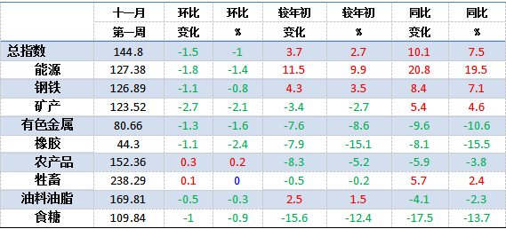 新华网北京11月7日电 十一月第一周(10月29日至11月4日),中国大宗商品价格指数(CCPI)为144.8点,比前一周下降1.5点,降幅1%;比年初上升3.7点,涨幅2.7%;比上年同期上升10.1点,涨幅7.5%。分类指数方面,共有七大类商品价格指数下降,其中橡胶类、矿产类降幅居前,分别下降2.4%和2.1%;农产品类上涨0.2%;牲畜类环比持平。