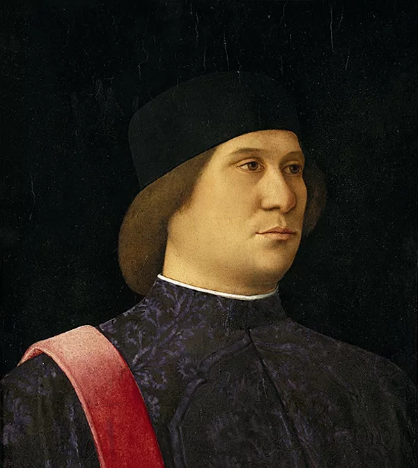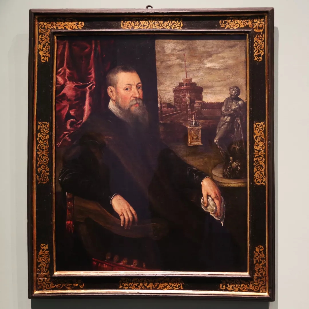 展览的第一幅作品,是威尼斯画派创始人乔凡尼·贝利尼的《行政长官的肖像》。乔凡尼·贝利尼不仅自身艺术水准高超还通过开办艺术学校,培养出缇香、乔尔乔内等优秀学生。肖像画中人物表情目光坚定,衣服的纹饰严谨、低调,身穿深蓝色有着精美图案的外衣,并佩带一条表明身份的红色绶带,画面古典恬静。画中人物展现的是四分之三侧面——四分之三侧面被认为是最优美的角度,可以画出人物最优美的外貌。(小提示:小伙伴们可以试试拍照时露出自己的四分之三侧面哦,解锁拍照最美角度!)