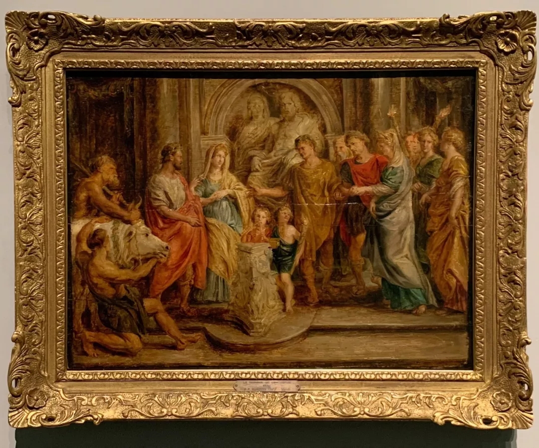 巴洛克风格画作强调立体感和空间感,并且充满激情和动感。这幅作品里人物众多,却很好地表现了前后的层次感,画面中的装饰带有明显历史感。画中左下扶着牛的这个农夫,肌肉线条鲜明,带着律动;中间两个小孩子则让画面充满活力。