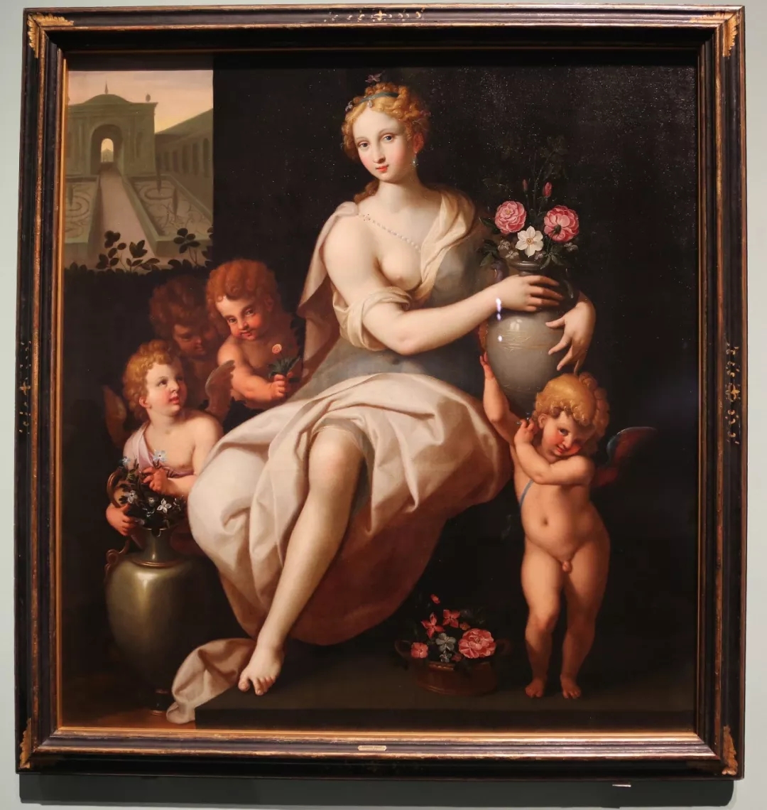 芙罗拉是古罗马花神,经常被认为是希腊神话花神克洛丽斯的化身。这一主题逐渐从神话中剥离出来,成为单独的女神像主题。这幅画边缘有两个瓷器,上面露出他们的花,周围几个小天使簇拥着中间半裸的花神,显得韵味十足,灵动明艳。