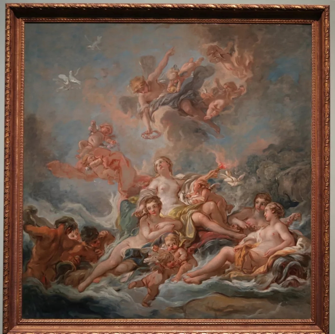 布歇是洛可可的代表人物。这幅作品描绘的是维纳斯在水中诞生上岸的场景。画面中央皮肤白皙,姿态美艳的女子就是维纳斯,她的上方是正要将代表胜利的桂花之冠戴在她头上的西风之神泽费罗斯,旁边的丘比特手中握着象征永恒之美的金苹果。整个场景轻松愉悦,无忧无虑,洋溢着贵族享乐的浪漫气息。