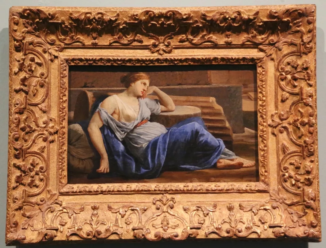 这幅画描绘了胜利女神维多利亚躺卧在被异族侵略破坏后的罗马废墟中的场景。我们可以观察一下人物身上的服饰,丝绸的半透明通透感完成得非常好。古典主义的绘画方式就是从里到外,像穿衣服一样一层一层上色描画。这样当我们欣赏作品时,就好像可以看到人物肌肤的纹理、服装的材质和纹路。