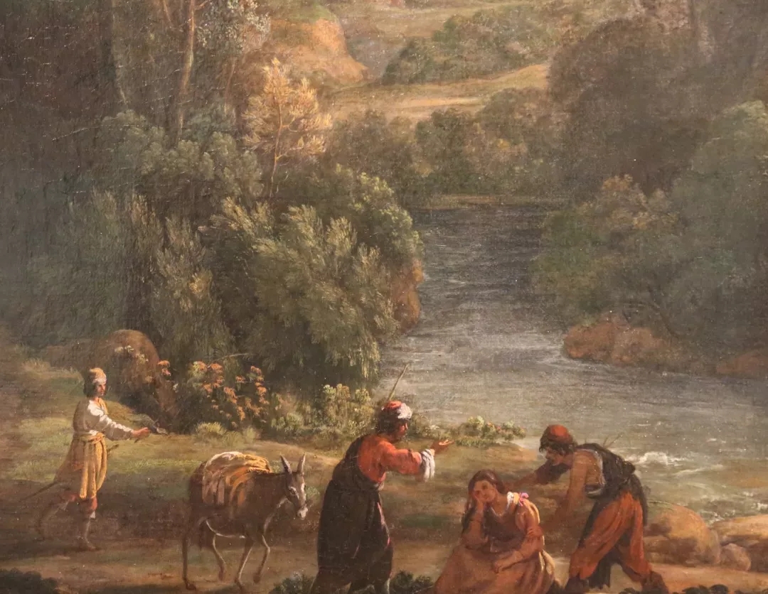 画家洛兰的作品总是描绘静谧的、幽静的理想主义风景,他的风景画里始终以人为切入口。这幅画里的人物是和宗教题材相关的。中央的女性是普赛克,她被丘比特抛弃之后,沮丧地坐在地上,旁边的农夫正在安慰她。褐色的近景、绿色的中景和广阔的蓝色远景共同构筑起这幅作品,而且洛兰的光影运用有自己的独到之处,我们可以看到,画面右上方打下的一束微光,将画中几个人物连成了一条线。