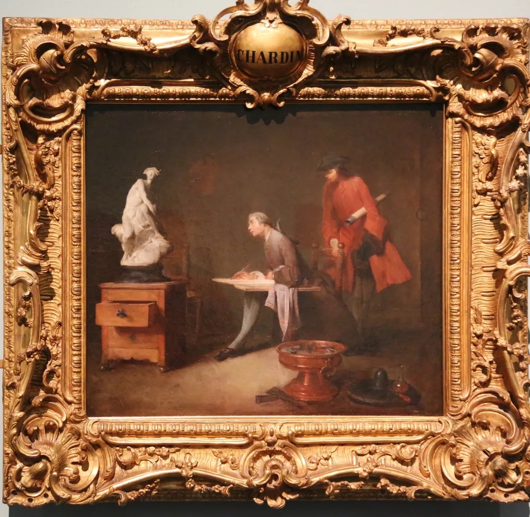 夏尔丹把更多的眼光放到中产阶级,描绘市民的内心世界。材料精致、颜料艳丽、色调素雅,人物看起来沉稳、有思想,室内气氛安详,夏尔丹的画将当时的风俗场景表现得淋漓尽致。