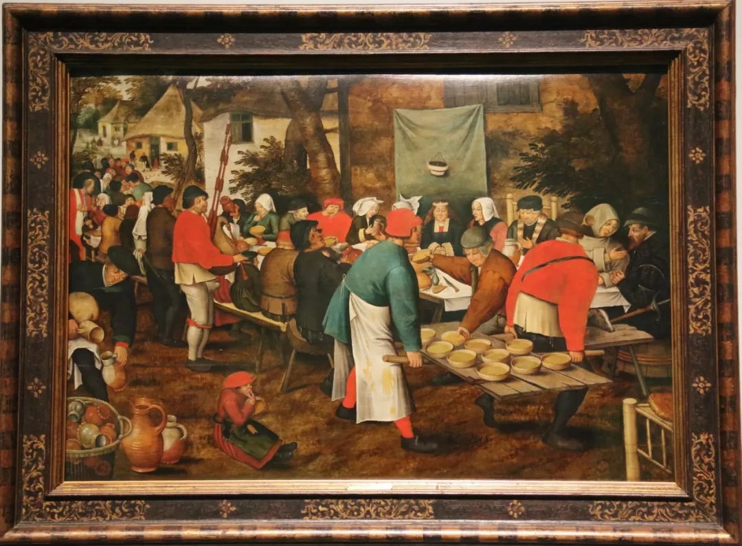这幅作品是勃鲁盖尔一族中小彼得·勃鲁盖尔模仿其父亲同名作品所绘,老勃鲁盖尔创作这幅画时参考了基督教艺术主题中“迦拿的婚宴”,生动地描绘了贫苦的农民家简陋的婚礼。小勃鲁盖尔在这幅画中的细节处理,不如他父亲原画中精细和传神。