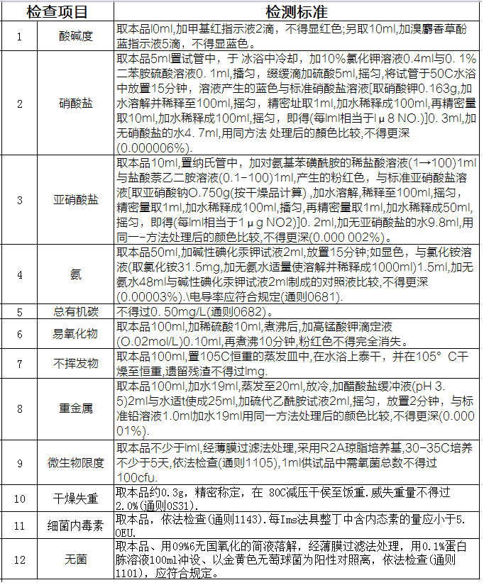 本品为饮用水经蒸馏法、离子交换法、反渗透法或其他适宜的方法制得的制药用水,不含任何添加剂。性状:本品为无色的澄清液体无臭。