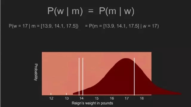 对于完美的不可知论者来说,也不是什么特别糟糕的事情,而且无需对结果做出什么假设。例如本例中,即便假定当Reign的体重为13镑、或1镑,或1000000 镑,让数据说话。我们先假定一个均一的先验概率,即对所有值而言,概率分布就一常量值。贝叶斯定理便可简化为P(w | m) = P(m | w)。