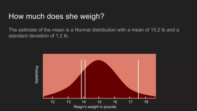 在Reign的案例中,我确实拥有其它的信息。我知道上次它在兽医诊所称到的体重是14.2镑。我还知道它并不是特别显胖或显瘦,即便我的胳膊对重量不是特别敏感。有鉴于此,它大概重14.2镑,相差一两镑上下。为此,我选用峰值为14.2镑。标准偏差为0.5镑的正态分布。