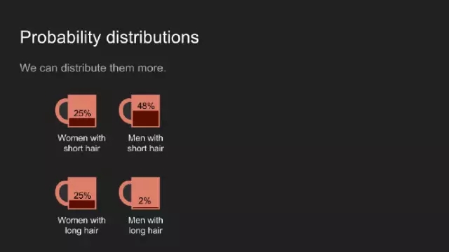 或者我们用四个杯子代表性别和发长的所有组合分布。这两个案例中,总咖啡数量累加起来为一杯。
