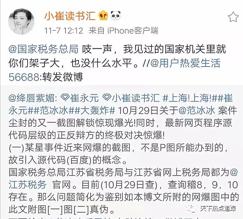 11月7日,小崔再次放出重炮,发博亮出范冰冰的猛料,并直接点名怒批有关部门不作为。