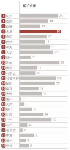 在本维度中设计了五个变量,分别是“医护资源”、“医疗设施”、“养老服务”、“城市交通安全指数”和“灾害损失”。本维度排名前五位的城市分别为杭州和成都(并列)、西安、太原和贵阳,随后是武汉、珠海、长沙和郑州(并列)以及济南。