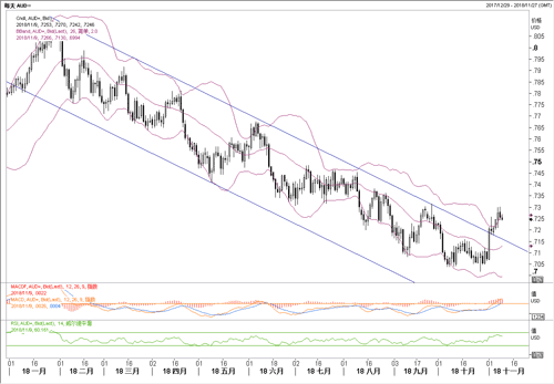 货币:澳元/美元 阻力位2:0.7340 阻力位1:0.7300 即期价格:0.7248 支持位1:0.7220 支持位2:0.7180
