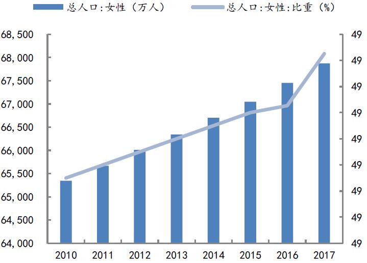 女性消费者数量增加,收入提高,消费潜力巨大。1)数量方面,2010-2017年,中国女性人口由6.53亿增长至6.79亿,占总人口比重由48.73%升至48.83%。2)就业方面,女性就业率提升,2016年全国就业人口中女性占比达到43.1%,就业质量和收入水平得到同步提高。3)教育方面,根据中国统计年鉴的数据显示,2016年接受大专教育及以上的女性占全部女性人口的比例达到了46.79%。女性学历水平的提高提升了职场女性的数量及地位,进而推升了职场女性的薪资水平和消费能力。这一系列变化给我国的轻奢女装品牌提供了良好的契机和发展的沃土。