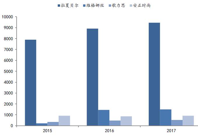 轻奢女装与商务休闲男装行业发展路径不同,由于时尚化程度高、产品定价偏向中高端,因此更加注重对于终端渠道的掌控力,具体表现在数据上则为单店收入较高。为了在有限的渠道数量上创造更高的销售收入,轻奢女装品牌企业不断加强单店管理能力,应用信息化手段进行库存管理,实施销售人员交替项目,宣传优秀门店成功案例等。通过比较各个