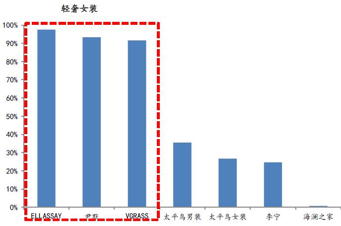直营店为主导的渠道模式。相较于男装等细分行业,轻奢女装面向客户具有更高的时尚潮流意识,需要不断根据时尚元素调整产品设计和生产,因而产品的周转也更加迅速。在直营模式下,公司可以及时有效的抓取终端零售数据,对市场做出快速反应,同时可以利用信息化管理存货并迅速调整订货策略,充分获取销售环节的利润空间。此外,直营店有利于统一贯彻公司策略以及客户服务,保证营销推广力度,为公司不断提升品牌档次提供了强有力保障,避免了品牌形象在加盟模式下受损的风险。越来越多的轻奢女装企业开始加大直营门店的投资力度。中为咨询比较了部分运动装、男装、休闲装、大众女装和轻奢女装单一品牌的直营店数量占比,可以看到轻奢女装直营店占比较高。