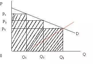 很显然,经过这样的区别定价后,我的包子铺收入,就从原来的P3*Q3这个矩形的面积,扩大到了 整个阴影部分。显然,后者要大于前者。