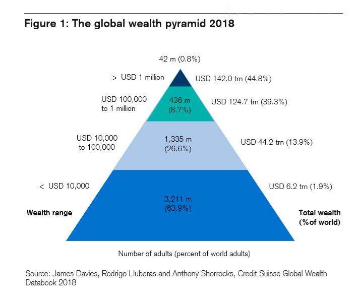 剖析财富结构也是财富报告的一个重要议题,瑞信在报告中直指全球贫富差距仍然是惊人的:占全球一半人口的“待富阶层”所拥有的资产不到1%,而85%的财富由最富有的10%所掌握,其中1%的顶级富人就拥有近半的全球财富(47%)。