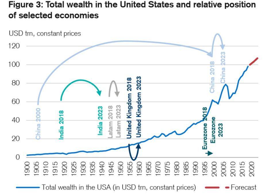 鉴于美国在财富创造上取得的巨大成就,瑞信研究团队特制了一张有趣的图(如下),将各主要经济体财富总量和未来五年的发展节奏,与美国20世纪以来的财富之路进行对比。