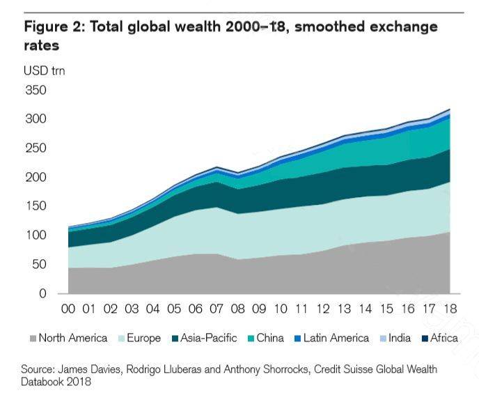 在世纪之初的8年中,全球财富中位数保持14%的年均增长,远超同期GDP,至2008年达到近4000美元。除北美外,所有地区都见证了80%以上的强劲增长。可以看出,本世纪以来的财富积累,大部分发生在那个年代(见下图)。那是全球范围的“黄金时代”!