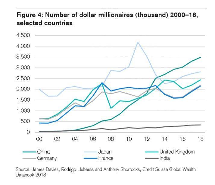 百万富翁(美元净资产)的数量和增长趋势,通常被用来衡量一个国家经济健康度和造富能力。本世纪以来,中国的百万富翁数量快速增长。2000年时,只有4.1万名左右的百万富翁,到了今年,已经有超过350万居民拥有百万美元以上的净资产,整整80倍的增长。可以从下图那条深绿色曲线的斜率,直观感受一下这个国家疯狂的造富速度。