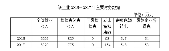 该企业2016年自行申报收入总额为3996万元,其中自行申报增值税免税收入829万元,期末留抵税额98万元,缴纳增值税0元,缴纳企业所得税64万元;2017年自行申报收入总额为3879万元,其中自行申报增值税免税收入775万元,期末留抵税额154万元,缴纳增值税0元,缴纳企业所得税58万元。