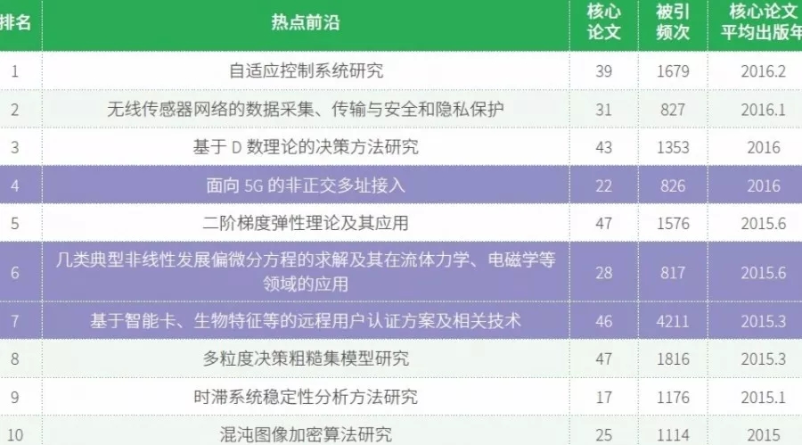 数学、计算机科学与工程学领域位居前10位的热点前沿主要集中在基于二阶梯度弹性理论、非线性发展方程求解、远程用户认证、D 数理论的决策方法、决策粗糙集模型、混沌图像加密算法、自适应控制系统、时滞系统稳定性、面向5G的非正交多址接入、无线传感器网络等领域。