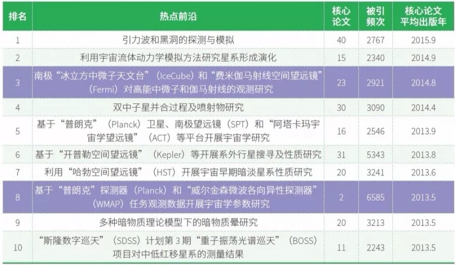 此外,多项研究主题继续体现出与观测平台高度相关的领域特点,例如基于“普朗克”探测器(Planck)和“威尔金森微波各向异性探测器”(WMAP)任务观测数据开展宇宙学参数研究的2 篇论文以6585 次的被引频次形成2018 年的热点前沿之一。