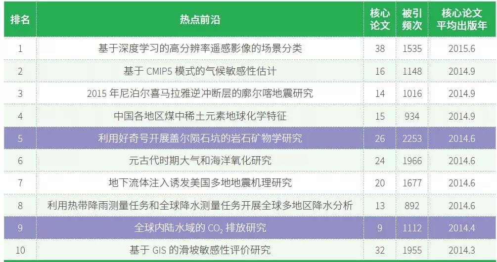 地球科学领域位居前10 位的热点前沿仍然集中在气候变化、地球化学、固体地球物理学和地质学研究。