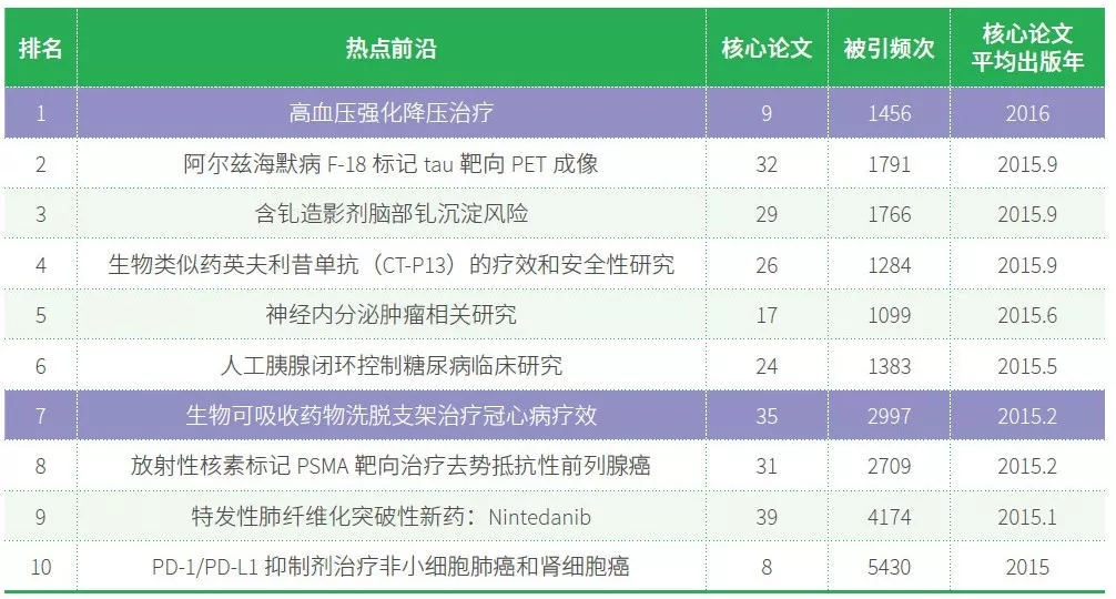 临床医学领域位居前10 位的热点前沿主要集中于肿瘤靶向治疗、慢性病治疗新手段和标准、放射性核素标记成像诊疗应用及副作用、小分子激酶抑制剂新药疗效、生物类似物疗效与安全性分析5 个前沿群。