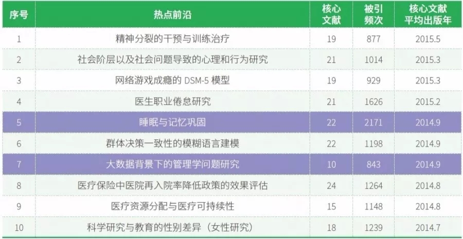 2018 年经济学、心理学及其他社会科学领域位居前10 位的热点前沿主要分布在心理学、社会学和经济管理学领域,其中40% 的热点前沿集中在心理学领域,包括“睡眠与记忆巩固”、“精神分裂症的干预与训练治疗”、“社会阶层以及社会问题导致的心理、行为研究与干预”、“网络游戏成瘾的DSM-5 模型”。