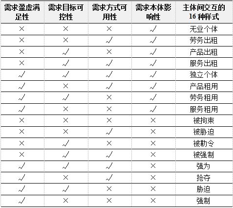上表罗列的是需求的底层基本样式,实际上还有更加复杂的演绎样态,下面从两个方面说明。其一,当存在多个主体博弈时,需求关系会受环境因子所影响,并衍生出16种交互嵌套样式,具体如下表所示: