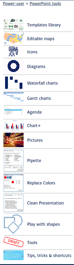 Don't reinvent the wheel for every slide. Insert a template slide from the Power-user add-in's library and just adapt it to match your needs. Templates include typical slide types, strategy frameworks, diagrams, etc and will adjust to your company's color scheme. You can also save your own slides in the templates library to keep them accessible anytime.