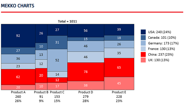 Create Mekko Charts in your Excel spreadsheet with Power-user. Mekko are one of the most powerful chart types. It can represents 3 dimensions of data, and is popular in consulting to show market positions of different companies for instance.