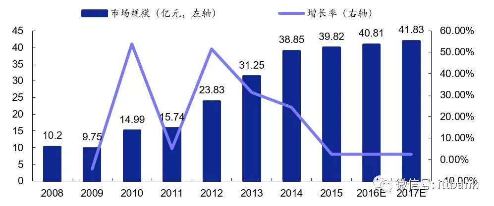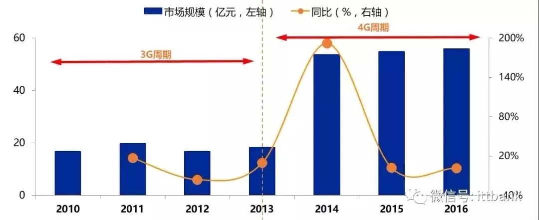 3G~4G 是无源天线的时代,天线主要构成部件包括馈线接头、天线振子、移相器、电机、天线罩和反射板等部件,天线材料主要以五金和塑料为主,射频器件主要包括(金属腔体)滤波器、双工器、合路器等。供应商方面,天线厂商主要包括通宇通讯、摩比发展、京信通信和华为,射频厂商为大富科技、武汉凡谷、春兴精工等。在4G 周商用初期(2014 年),我国基站天线的市场规模就达到53.8 亿元,同比增长192%,2015、2016 年市场保持稳定增长。
