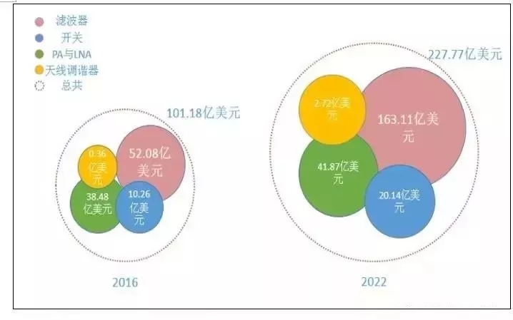 2016年手机射频前端(包含天线开关、滤波器、双工器、PA功率放大器、LNA低噪声放大器)市场规模为101亿美元,预计到2022年将达到227 亿美元,复合年增长率为14%。其中滤波器是重点,在2022年可达到163亿美元级别(占比最大)。