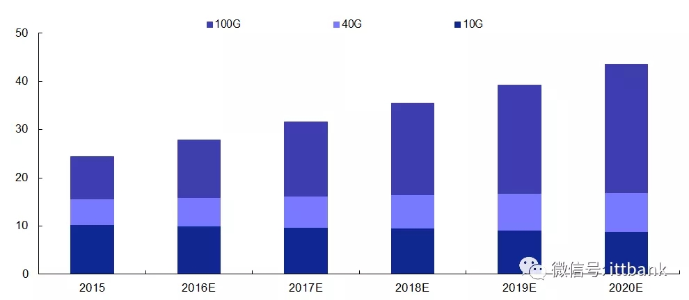 ▲全球10G/40G/100G 光模块细分销售收入预测(亿美元)