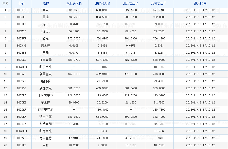 中国银行外汇牌价 2018-11-13(图片来源:东方财富网)