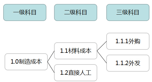 会计科目表的设计主要是要解决会计科目的名称确定、分类排列、科目编号的问题。会计科目表还列出了一级会计科目的名称和科目编号,各阿米巴单元在设计会计科目表时,应根据需要设计并列出全部一级科目及其所属的全部明细科目名称及编号,以增强会计科目名称的统一性和会计信息的可比性。以此类推,除了一级科目之外,还有二级科目、三级科目等。如图所示: