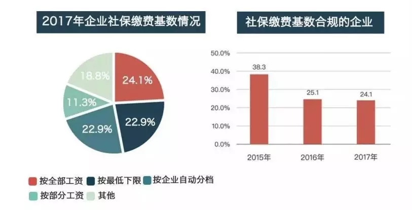 根据51社保2017年度《中国企业社保白皮书》的数据显示,社保缴费基数合规企业的比例从2015年的38.3%到2016年的25.1%,再到2017年的24.1%,这意味着将近76%的企业社保缴纳基数不合规,其中接近23%的企业统一按最低基数缴费,有22.9%的企业按企业自行分档基数缴纳,还有11.3%的企业按固定工资部分缴纳(未计入奖金部分金额),因此企业社保合规面临愈来愈大的压力。