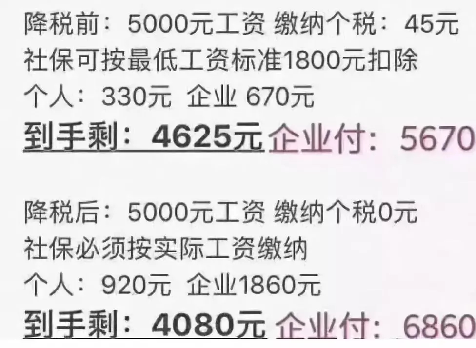 对比前段时间网络热传的个税改革后到手工资对比图可知,到手工资之所以会下降根本原因是缴费基数发生了变化,由先前的按最低工资标准扣除到现在按实际工资扣除。如果从表面上将个税改革与社保改革联系起来看,会发现,这其实只是国家资金左口袋与右口袋的腾挪,把个税腾挪到社保上。但事实上,对于一直按照合规的社保缴费基数缴纳社保的人来说,在税前工资保持不变的情况下,降税后,到手工资其实是增加的,并不会减少。此外,本次个税改革完善了扣除模式,提高基本减除费用标准,新增专项附加扣除,所以从全国范围实际来看,难言新搭配之下个人可支配收入必然降低。此外,社保征管方式的变革对于保证广大中小企业员工的福利,从长远来看具有重要意义,也是中国正式进入全民社保的一个重大信号。