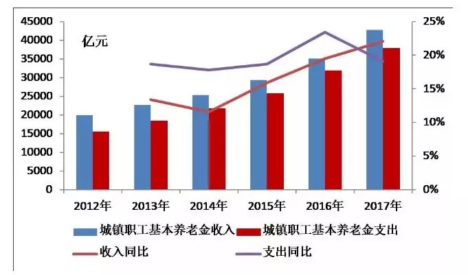 一方面,中国在2011年左右度过了人口红利的“刘易斯拐点”之后,人口老龄化成为困扰中国中长期发展的最大潜在隐患,近年来计划生育政策的放开也体现了国家人口政策的转向;另一方面,中国统筹结合的基本养老保险制度由于历史转轨成本和人口老龄化的来临,使得养老金未来的缺口将逐步加大。2017年,城镇职工基本养老保险基金总收入43310亿元,其中征缴收入33403亿元,全年基金总支出38052亿元,当期征缴收入已经低于当期支出,且资金规模仅相当于当期基金支出的87.78%。