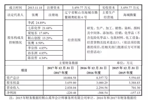 2013年11月,鞍山辉虹由张鹰、李宗伟、孙东洲和李武、梁旭东发起设立。张鹰、李宗伟和孙东洲曾经北京染料厂工作,有长期从事染颜料行业的经验,杭州信凯有资金和市场,梁旭东是鞍山本地人,熟悉了解当地情况,鞍山腾鳌当地环保设施配套较好,地方政府有一定的优惠政策,于是三方选择共同发起设立鞍山辉虹。