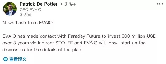 昨日,EVAIO(中文名:伊娃)公司在推特上宣布已于贾跃亭方面进行了洽谈,将通过STO方式在3年内,投资9亿美元(约合人民币62亿),双方会立即开始讨论投资计划得细节。该公司CEO Patrick也发布了相关信息。
