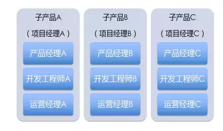 从图中不难看出,每个子产品部门是一个完整的闭环,使各部门更加聚合,提高了产品生产的效率,可以实现内部产品的快速决策和调整。虽然在产品经理、或者开发工程师的层面上,还会去继续向原来的研发中心总监汇报,但是从工作安排和计划方式来讲,会偏向于子产品驱动的模式。