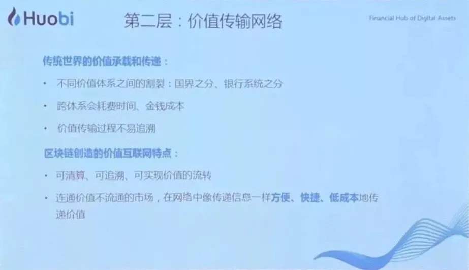 通过区块链点对点的传递,即价值互联网。它来源于这个层次,实际是构建信用的技术,构建了点对点的价值传输的网络,价值互联网。在可以想象的未来,在区块链上的资产,其实可以在全球自由配置、自由流通的,非常高效。
