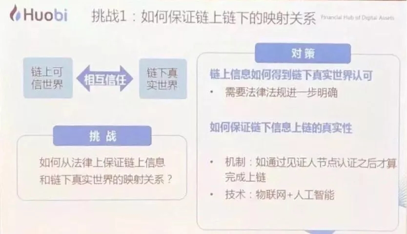 另外,线上与线下如何打通,如何防止线下作弊,这也是一个挑战。比特币是在自己的区块链内部体系运行。但是这个技术随着发展一定要与实体经济接轨,当为企业提供服务,为产业提供服务的时候如何防止作弊,这要依赖物联网技术等其他的技术来解决,区块链解决不了这个问题。