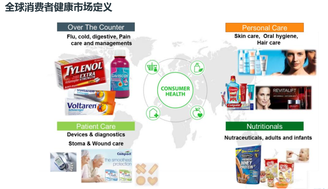 消费者健康领域包含:OTC、营养保健品、个人护理、病人护理